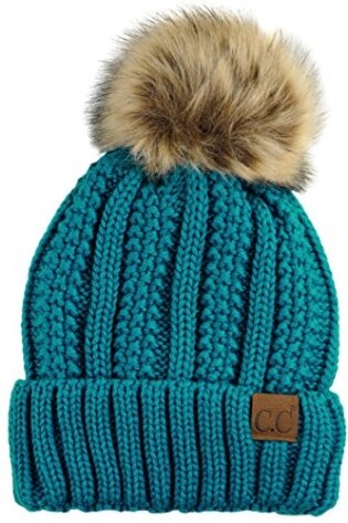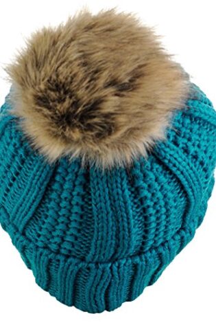 C.C Thick Cable Knit Faux Fuzzy Fur Pom Fleece Lined Skull Cap Cuff Beanie, Teal