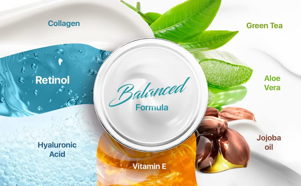 - Special formula: our face cream is made with thoroughly selected ingredients such as retinol for face, 5% hyaluronic acid, and collagen which create perfect combination to restore your skin elasticity; our retinol moisturizer is non-comedogenic and does not contain alcohol, gmo, gluten and paraben